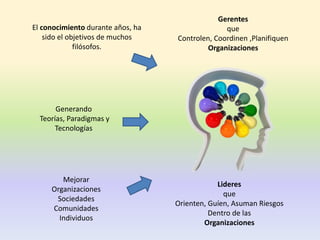 Este documento trata sobre la epistemología de la gerencia. Brevemente, discute que el conocimiento ha sido el objetivo de muchos filósofos y que los gerentes generan teorías, paradigmas y tecnologías para mejorar organizaciones, sociedades y comunidades. También, que la epistemología gerencial transforma organizaciones a través del liderazgo, la participación y la implementación de sistemas para controlar, coordinar, planificar y dirigir cambios.