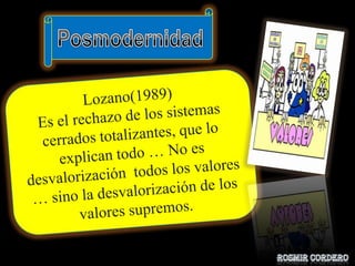 El documento habla sobre la posmodernidad. Define rasgos característicos como la incredulidad ante los grandes relatos, el hedonismo como fin supremo de la vida, y la disolución del sentido de la historia en múltiples historias microscópicas. También menciona que en una sociedad posmoderna la estética sustituye a la ética.