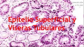 El documento describe los diferentes tipos de epitelio superficial, incluyendo epitelio estratificado plano, cúbico y cilíndrico. Explica que el epitelio es el tejido que recubre las superficies del cuerpo y forma las mucosas y glándulas. Además, provee protección a los tejidos subyacentes contra lesiones y microorganismos.