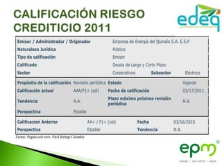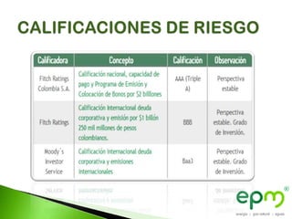 Este documento describe un grupo empresarial colombiano conformado por 44 empresas que prestan servicios de energía eléctrica, gas natural, agua potable, saneamiento básico, recolección de basuras y tecnologías de la información en Colombia, Centroamérica y España. El grupo fue fundado en 1955 y está liderado por Empresas Públicas de Medellín.