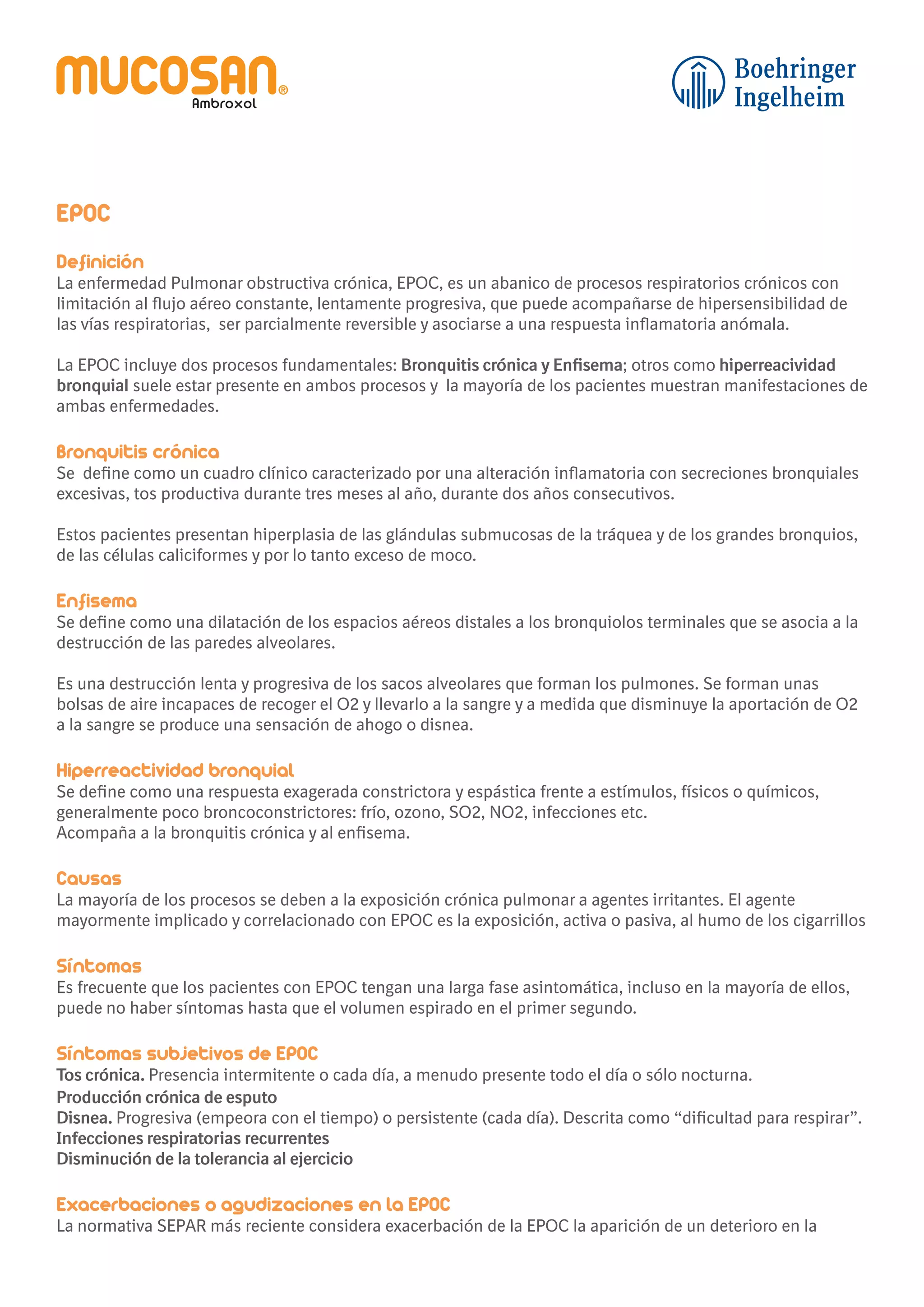 La EPOC incluye bronquitis crónica y enfisema, causados principalmente por la exposición al humo de tabaco. Los síntomas incluyen tos crónica, producción excesiva de moco, disnea y exacerbaciones recurrentes. El tratamiento se enfoca en mejorar los síntomas a través del uso de broncodilatadores, corticoides, antibióticos y mucolíticos. La medida más efectiva es prevenir la enfermedad mediante la abstención del tabaquismo.