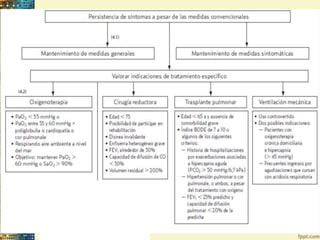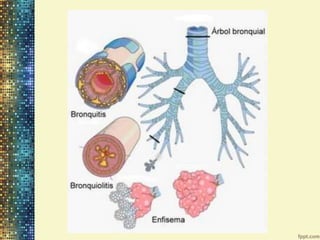 Este documento describe la enfermedad obstructiva crónica (EPOC), caracterizada por obstrucción crónica y progresiva del flujo aéreo causada por inflamación en los pulmones. La EPOC es la quinta causa de mortalidad en el país y el 90% de los casos son causados por tabaquismo. Provoca cambios estructurales en los bronquios, bronquiolos y parénquima pulmonar que conducen a disminución del flujo aéreo y alteraciones en la ventilación/perfusión pulmonar, causando síntomas