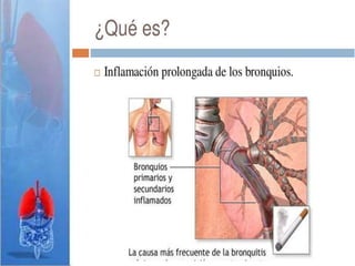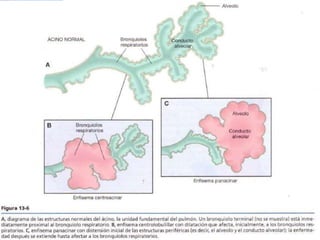 La EPOC se caracteriza por un bloqueo persistente del flujo de aire y tiene dos formas principales: bronquitis crónica y enfisema. El enfisema es un trastorno pulmonar que causa un aumento irreversible del tamaño de los espacios aéreos distales y la destrucción de sus paredes. Existen cuatro tipos de enfisema clasificados según su distribución anatómica: centroacinar, panacinar, acinar distal e irregular.