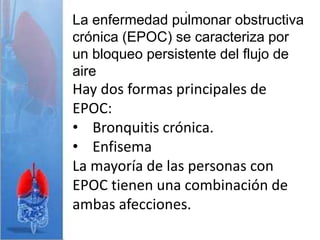 La EPOC se caracteriza por un bloqueo persistente del flujo de aire y tiene dos formas principales: bronquitis crónica y enfisema. El enfisema es un trastorno pulmonar que causa un aumento irreversible del tamaño de los espacios aéreos distales y la destrucción de sus paredes. Existen cuatro tipos de enfisema clasificados según su distribución anatómica: centroacinar, panacinar, acinar distal e irregular.