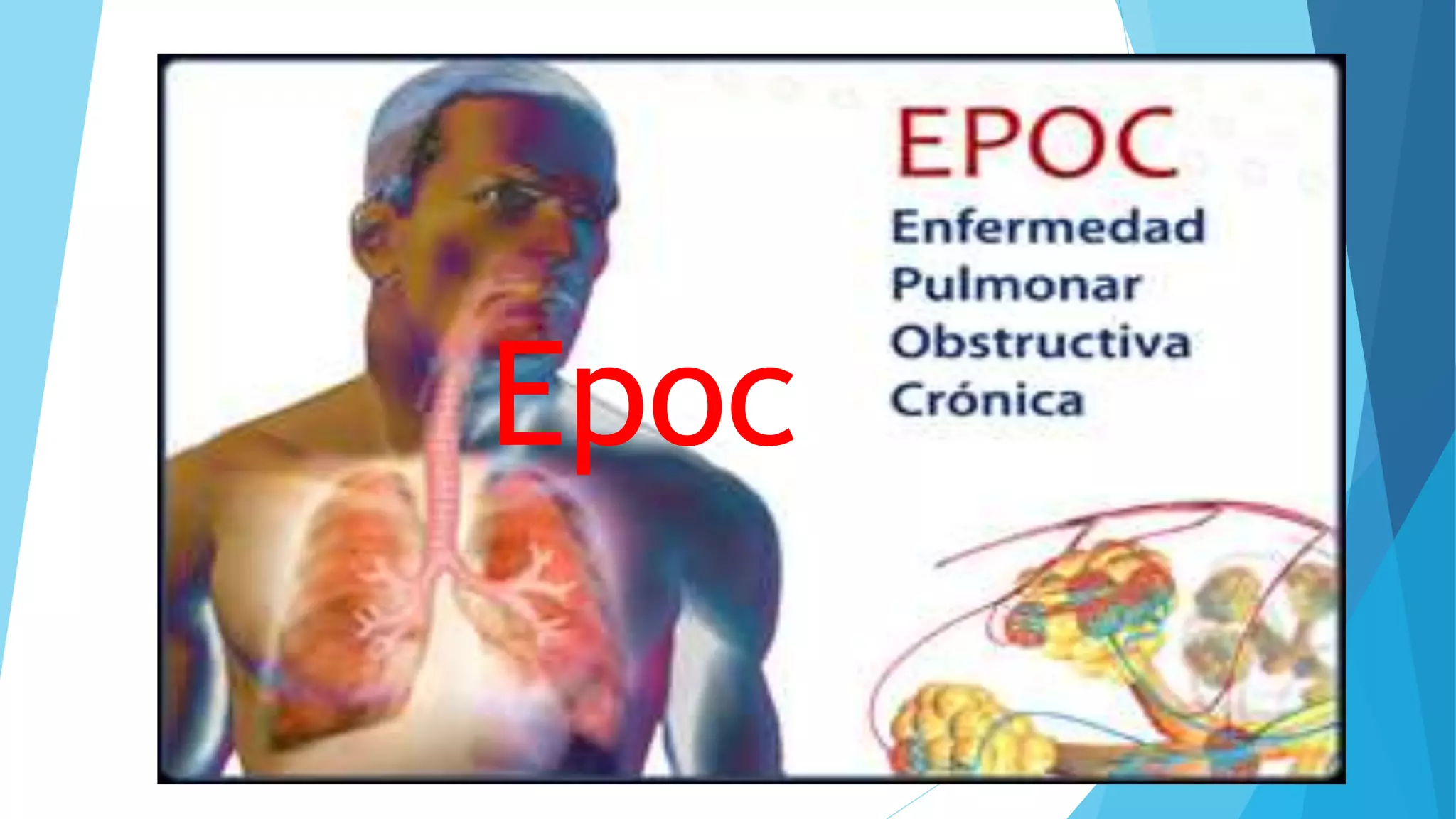 La enfermedad pulmonar obstructiva crónica (EPOC) se caracteriza por una limitación progresiva y no reversible del flujo aéreo, principalmente causada por el tabaquismo y la exposición a contaminantes. Los síntomas incluyen tos, disnea y expectoraciones purulentas, y el diagnóstico se realiza mediante historia clínica y pruebas funcionales respiratorias. El tratamiento incluye medidas no farmacológicas como dejar de fumar y oxigenoterapia, así como fármacos como broncodilatadores y corticoides inhalados.