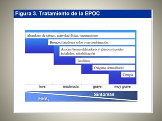 Este documento presenta información sobre la enfermedad pulmonar obstructiva crónica (EPOC), incluyendo su definición, fenotipos clínicos, factores de riesgo, fisiopatología, diagnóstico, evaluación de la gravedad, tratamiento y rehabilitación. Resume los principales tipos de tratamiento farmacológico para la EPOC estable y las exacerbaciones, así como las opciones de broncodilatadores de acción corta y larga. También discute los enfoques de evaluación y clasificación de la graved