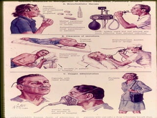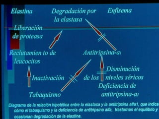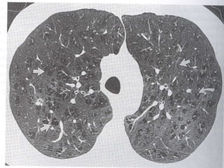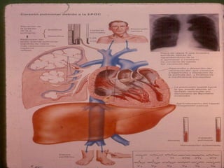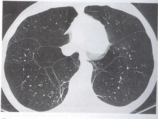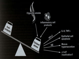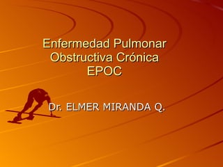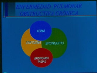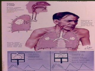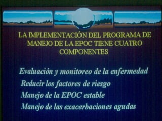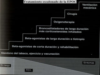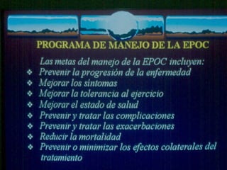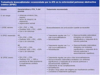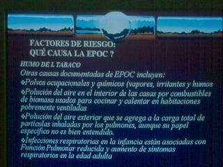 El documento describe la Enfermedad Pulmonar Obstructiva Crónica (EPOC) y sus principales efectos sistémicos, incluyendo inflamación, estrés oxidativo, alteraciones nutricionales y disfunción muscular. También presenta la Escala de disnea del Medical Research Council, que clasifica cinco niveles de disnea relacionados con la capacidad de caminar. Finalmente, enumera cinco criterios para el alta hospitalaria de pacientes con EPOC, como la capacidad de alimentarse, caminar y comprender el tratamiento de forma independiente.