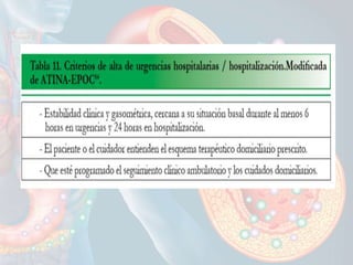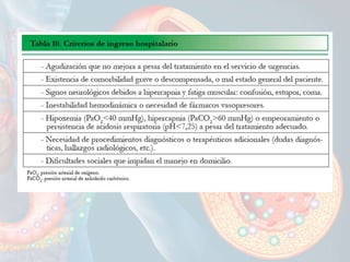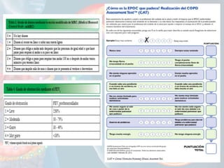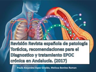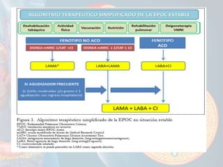 Este documento resume las recomendaciones para el diagnóstico y tratamiento de la EPOC. La EPOC es una enfermedad respiratoria crónica caracterizada por una limitación al flujo aéreo no reversible totalmente. Afecta a una proporción significativa de la población mayor de 40 años y es una de las principales causas de muerte. El documento describe las pruebas de diagnóstico, los diferentes fenotipos de EPOC, las comorbilidades asociadas, y las opciones de tratamiento farmacológico y no farmacoló