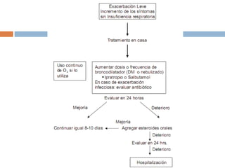 Las intervenciones prioritarias para el tratamiento de EPOC son dejar de fumar y usar oxígeno suplementario en pacientes con hipoxemia. Se recomienda el abandono del tabaco a través de consejo médico o programas cognitivo-conductuales intensivos, y el tratamiento farmacológico del tabaquismo. La oxigenoterapia a largo plazo mejora la sobrevida y calidad de vida en pacientes con insuficiencia respiratoria. Los broncodilatadores, anticolinérgicos, corticoides y rehabilitación pul