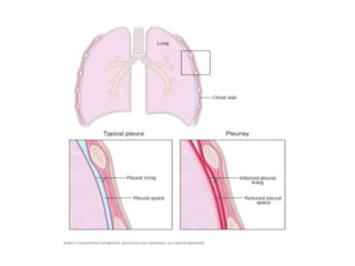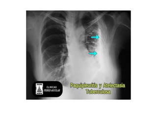 Este documento presenta información sobre la EPOC y la pleuresía. Describe los signos radiográficos del enfisema pulmonar hiperinflado como diafragmas aplanados y aumento de espacios intercostales. También describe hallazgos de TC como espacios enfisematosos con vidrio esmerilado y bullas bilaterales. Respecto a la pleuresía, muestra radiografías con derrame pleural, engrosamiento pleural, neumonía de base e infiltrados. Finalmente, presenta ultrasonidos que evidencian derrame pleural tabicado