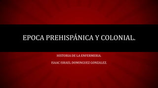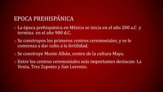La época prehispánica en México abarcó desde el 200 a.C. hasta el 900 d.C., cuando se construyeron los primeros centros ceremoniales. Los aztecas desarrollaron la medicina más importante de México antiguo, con curanderos que usaban plantas medicinales y espíritus como Xipetotec y Chalchiuhtlicue para tratar enfermedades. Durante la época colonial de 1524 a 1810, los frailes franciscanos introdujeron la imprenta y médicos como Alvares Chanca y Martín de la Cruz documentaron