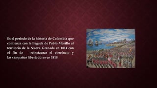 Este documento resume los hechos clave de la Reconquista española en Colombia entre 1814 y 1816. Incluye detalles sobre la llegada del general Pablo Morillo a Cartagena con 15,000 soldados españoles, el sitio de 106 días de la ciudad y su rendición. También describe cómo Morillo estableció regímenes de terror en Santa Fe de Bogotá y otras ciudades, incluida la ejecución de cientos de patriotas colombianos.