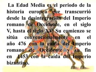 La Edad Media abarcó los siglos V al XV en Europa, desde la caída del Imperio Romano hasta el Renacimiento. Fue una época de profunda religiosidad definida por el feudalismo, el uso de lenguas romances y una organización social por estamentos. La literatura medieval incluyó narrativa épica y religiosa tanto de carácter popular como culto, transmitida oralmente y con fines didácticos.