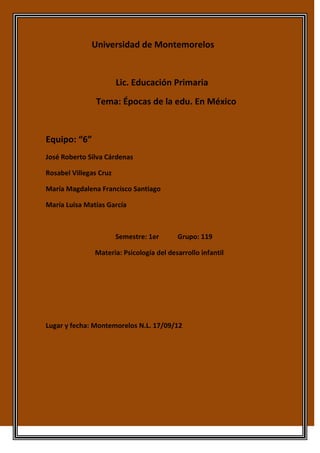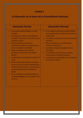 El documento analiza la educación en México durante la época de la consolidación nacional, destacando la educación formal e informal y la influencia europea en el sistema. Se menciona la escasez de recursos y la enseñanza centrada en la ciencia, además de la búsqueda de educación laica por parte de Benito Juárez. También se señala la desigualdad en el acceso a la educación y el uso de métodos pedagógicos controvertidos.