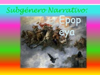 Este documento describe la epopeya como un subgénero narrativo que presenta una gran acción o hazaña protagonizada por héroes, contiene elementos sobrenaturales, y se compone de varias partes delimitadas. También explica las características comunes de las epopeyas como la invocación a las musas, descripciones detalladas, discursos formales y la intervención de dioses. Finalmente, resume La Odisea de Homero, la famosa epopeya que narra el viaje de regreso del héroe Odiseo