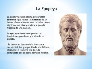 La epopeya es un poema solemne que relata las hazañas heroicas de un héroe y que tiene significación para la historia de una nación. Generalmente se origina en tradiciones orales y cuenta las intervenciones de dioses, con una estructura dividida en cantos o rapsodas. Algunas de las epopeyas más famosas son la Ilíada, la Odisea y la Eneida.