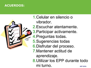 El documento presenta información sobre los elementos de protección personal (EPP), incluyendo su definición, objetivos de aprendizaje, legislación relevante y factores a tener en cuenta para su selección. El facilitador explica que los EPP son dispositivos diseñados para proteger al trabajador de posibles lesiones y constituyen un control básico de riesgos cuando no se han podido eliminar por completo los peligros. Además, destaca la obligación legal del empleador de suministrar y enseñar a usar los EPP de forma adecuada