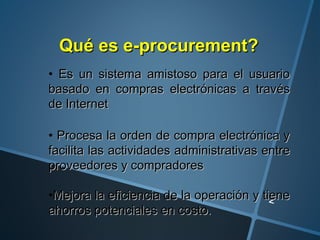 El documento describe e-procurement, que es un sistema basado en compras electrónicas a través de Internet que procesa órdenes de compra y facilita actividades entre proveedores y compradores. E-procurement moderniza las prácticas comerciales en el sector privado a través de Internet, proporcionando ahorros a proveedores y compradores. Funciona mediante el flujo de información en tiempo real entre usuarios y vendedores calificados para encontrar necesidades de compradores.
