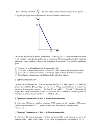 1. El documento presenta un problema de maximización de utilidad bajo restricción presupuestaria para Marita Rambana. Resuelve el problema para diferentes tamaños de jardín y grafica la demanda marshalliana de manzanas y ajíes.