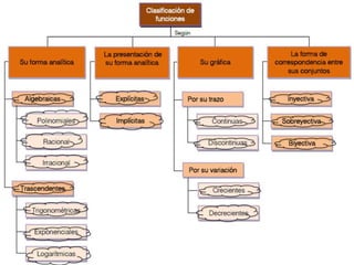 Este documento describe diferentes tipos de funciones, incluyendo funciones algebraicas (polinominales y racionales), funciones irracionales, funciones trascendentales (trigonométricas, exponenciales y logarítmicas), funciones explícitas e implícitas, funciones continuas y discontinuas, funciones crecientes y decrecientes, funciones inyectivas, sobreyectivas y biyectivas.