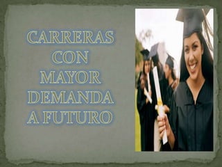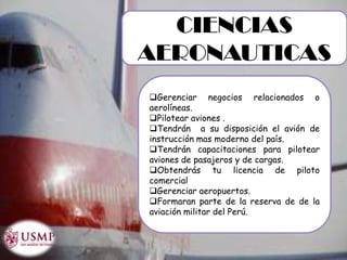 El documento presenta varias carreras universitarias. La carrera de Ciencias Aeronáuticas se enfoca en la gestión de negocios relacionados a aerolíneas y enseña a pilotear aviones. La carrera de Administración de Negocios Internacionales capacita a los estudiantes en el proceso de comercialización internacional y negocios globales. Finalmente, la carrera de Marketing explica que esta disciplina contribuye al bienestar nacional a través de satisfacer las necesidades del público.