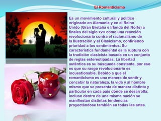 El documento trata sobre la música romántica. Explica que el romanticismo surgió como una reacción contra la Ilustración y el Clasicismo, dando prioridad a los sentimientos. También define la balada como una forma de expresión cortesana del siglo XIV caracterizada por repetir un estribillo al final de cada tres estrofas. Finalmente, ofrece una definición de música como el arte de organizar sonidos y silencios mediante melodía, armonía y ritmo, siendo un producto cultural.