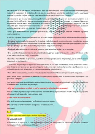 La quinta fase de Design Thinking es evaluar, en la cual se someten los prototipos a usuarios para obtener retroalimentación. Se explica la técnica de la "Malla receptora de información" para recopilar comentarios de usuarios sobre los prototipos en cuatro categorías: cosas interesantes, críticas constructivas, preguntas y nuevas ideas. Con esta información, el diseño del prototipo puede ser mejorado.