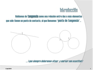 1) Se describen conceptos geométricos relacionados con la tangencia como puntos de contacto, distancias constantes entre rectas paralelas, puntos equidistantes de dos rectas, y relaciones entre radios y centros de circunferencias.