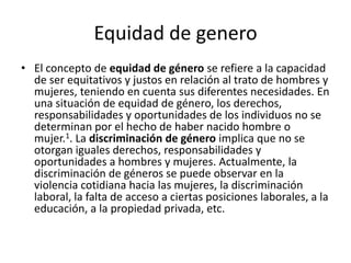 La equidad de género se refiere a la capacidad de tratar a hombres y mujeres de manera justa y equitativa según sus necesidades, garantizando igualdad de derechos, responsabilidades y oportunidades independientemente de su sexo. Lograr la equidad de género es un reto que requiere formular políticas para garantizar a las mujeres acceso a educación, empleo, salud y seguridad, así como cambiar las mentalidades para promover su participación en todos los ámbitos de la sociedad.