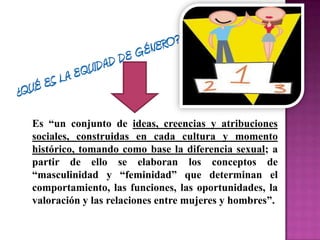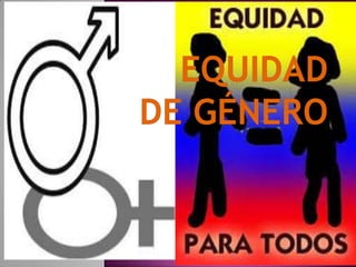 Este documento define el concepto de género como un conjunto de ideas sociales sobre las diferencias entre hombres y mujeres que determinan su comportamiento y roles. Explica que la equidad de género consiste en dar a hombres y mujeres las mismas oportunidades y trato, independientemente de su sexo, a través de la estandarización justa de oportunidades entre ambos. Su objetivo final es establecer acciones para superar la discriminación sexual y sensibilizar al público sobre la naturaleza antidemocrática de la exclusión basada en el géner
