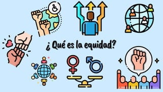 Este documento discute el concepto de equidad en educación. Define la equidad como justicia e igualdad de oportunidades sin importar género, condición económica u otras barreras. Explica que México ha adoptado programas para promover la equidad en el acceso y permanencia en la educación. También menciona que la constitución mexicana obliga al estado a proveer servicios educativos con equidad y excelencia, enfocándose en grupos marginados. Finalmente, propone formas de distribuir recursos de manera más equitativa entre escuel