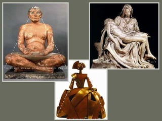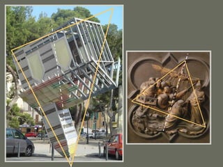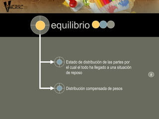 El documento aborda el concepto de equilibrio visual y físico en la composición artística, centrándose en factores como el peso visual, la simetría y la ubicación de los elementos en el campo visual. Se exploran diversas formas de lograr el equilibrio, incluyendo simetría axial, composición dinámica y la influencia del eje sentido en formas específicas, como triángulos y rectángulos. Además, se menciona la importancia del equilibrio visual en relación al equilibrio físico en obras tridimensionales.