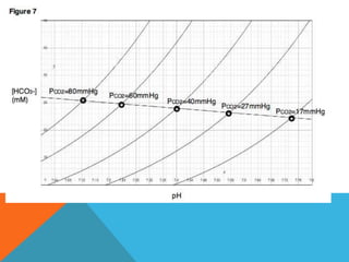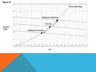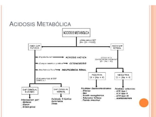 Existen dos tipos fundamentales de alteraciones ácido-base: las metabólicas y las respiratorias. Las metabólicas incluyen la acidosis y alcalosis metabólica, mientras que las respiratorias incluyen la acidosis y alcalosis respiratoria. El proceso mantiene el pH mediante la compensación del dióxido de carbono, el pH y la concentración de bicarbonato entre los sistemas respiratorio, renal y metabólico.