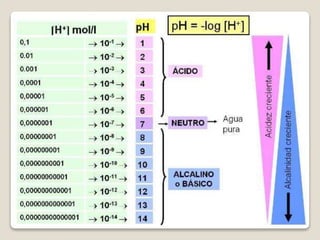 El documento trata sobre el equilibrio ácido-base en el cuerpo. Brevemente explica que el pH mide la concentración de iones de hidrógeno, y que el cuerpo mantiene la homeostasis a través de la regulación renal del bicarbonato y la compensación respiratoria del dióxido de carbono. Las alteraciones metabólicas que cambian el pH incluyen un aumento en la generación de iones hidrógeno o una pérdida de bicarbonato.