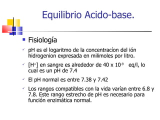 Este documento describe el equilibrio ácido-base en el cuerpo. Explica que el pH sanguíneo normal es de 7.4 y se mantiene entre 6.8 y 7.8. Describe los mecanismos de amortiguación como la conversión de CO2 en bicarbonato y la respuesta respiratoria y renal. También cubre las acidosis y alcalosis metabólicas, incluidas sus causas, respuestas compensatorias y clasificaciones.