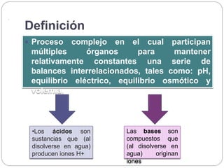 Este documento describe los trastornos metabólicos y respiratorios del equilibrio ácido-base. Define la acidosis y alcalosis metabólica en términos de concentraciones de H+, bicarbonato y pH. Explica que la acidosis metabólica se debe a una disminución de bicarbonato e involucra mecanismos de compensación respiratorios, renales e intracelulares, mientras que la alcalosis metabólica se debe a un aumento de bicarbonato con mecanismos compensatorios opuestos. También define