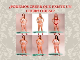Este documento describe diferentes tipos de siluetas corporales y ofrece recomendaciones de prendas para resaltar las cualidades de cada una. Identifica formas como triangular, rectangular, reloj de arena y oval, y sugiere objetivos y prendas para equilibrar cada silueta. El objetivo general es aprender a resaltar las propias características a través de la ropa para sentirse cómodo con el propio cuerpo.