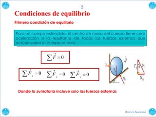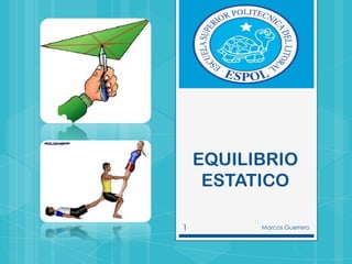 El documento explica las condiciones de equilibrio estático para cuerpos rígidos. Indica que un cuerpo está en equilibrio cuando la resultante de todas las fuerzas externas es cero y la suma de los momentos de torsión alrededor de cualquier punto es cero. También define el centro de gravedad como el punto donde se concentra toda la fuerza de gravedad de un cuerpo y explica cómo localizarlo y usarlo para resolver problemas de equilibrio.