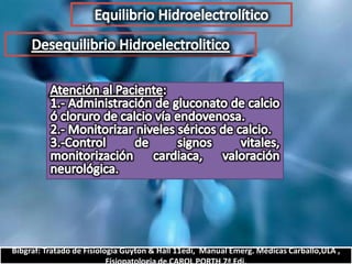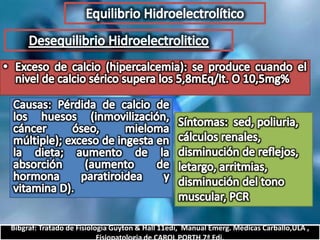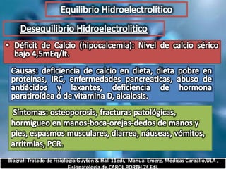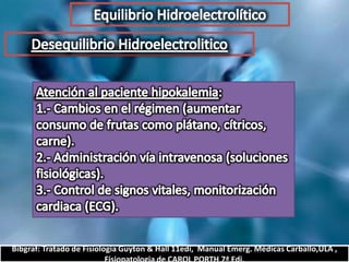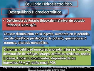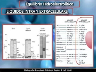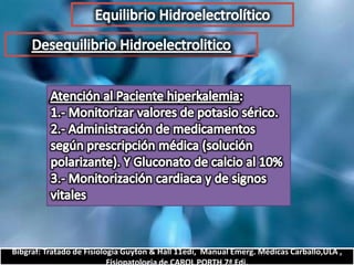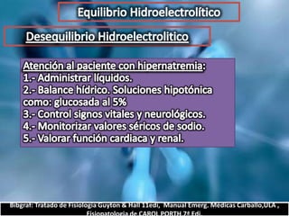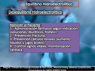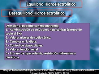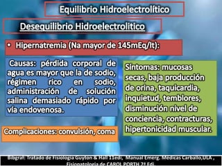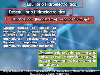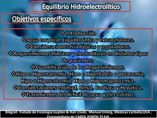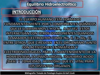 El documento describe el balance hídrico y electrolítico del cuerpo humano. Explica que el cuerpo ingiere aproximadamente 2,000-3,000 cc de agua por día a través de bebidas, alimentos y agua endógena, y egresa una cantidad similar a través de la orina, heces, transpiración y respiración. También detalla los niveles normales de sodio, potasio, cloro y otros electrolitos en el cuerpo.
