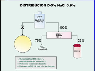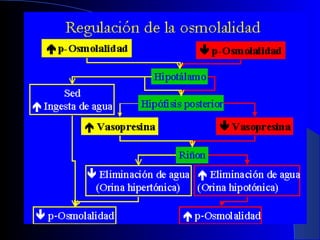 Este documento resume los principales conceptos relacionados con el equilibrio hidroelectrolítico del cuerpo. Explica la importancia biológica del agua y los mecanismos de transporte de agua y electrolitos a través de membranas biológicas, incluida la osmosis. También describe los factores que regulan el balance hídrico, como la hormona antidiurética y el sistema renina-angiotensina-aldosterona. Finalmente, analiza los intercambios de agua entre los compartimentos intra y extracelulares y