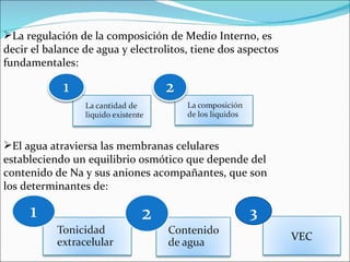 La regulación del balance de agua y electrolitos en el cuerpo humano depende principalmente del sodio y su equilibrio osmótico entre los compartimentos intracelular y extracelular. Existen dos mecanismos principales de regulación: 1) cuando aumenta la osmolaridad sérica se estimulan los centros hipotalámicos aumentando la sed y la ADH, favoreciendo la retención de agua, y 2) cuando disminuye la osmolaridad sérica se inhibe la sed y la ADH, favoreciendo la excreción de agua. Las alter