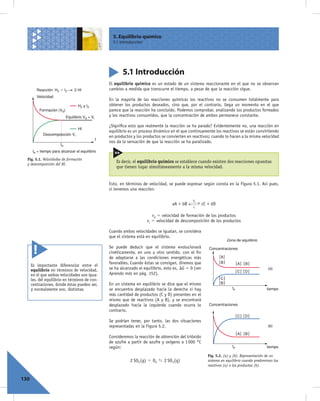 El documento describe el concepto de equilibrio químico. Se alcanza cuando la velocidad de formación de productos es igual a la velocidad de descomposición de los mismos, resultando en concentraciones constantes de reactivos y productos. Aunque la reacción continúa, parece detenida desde una perspectiva cinética. El equilibrio es dinámico, no estático, y las concentraciones pueden variar dependiendo de las cantidades iniciales, aunque la constante de equilibrio Keq permanece inalterada.