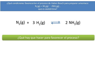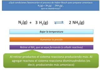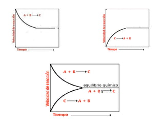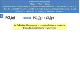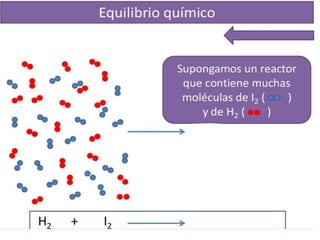 Este documento trata sobre el equilibrio químico. Explica que el equilibrio químico es un estado dinámico en el que las concentraciones de todas las especies reaccionantes (reactivos y productos) permanecen constantes a pesar de que continúan reaccionando. También introduce la constante de equilibrio Kc, la cual relaciona las concentraciones de reactivos y productos en el equilibrio de manera que permanece constante a una temperatura dada. Además, explica cómo calcular las concentraciones de equilibrio a