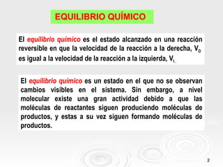 Este documento trata sobre el equilibrio químico. Explica que el equilibrio químico se alcanza cuando la velocidad de la reacción directa es igual a la velocidad de la reacción inversa. También describe cómo factores como cambios en la concentración, presión, temperatura o la adición de catalizadores afectan la posición del equilibrio químico. Finalmente, introduce los conceptos de constante de equilibrio y cómo se expresan para diferentes tipos de reacciones químicas.