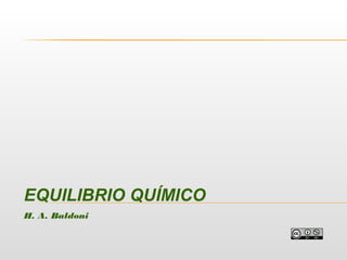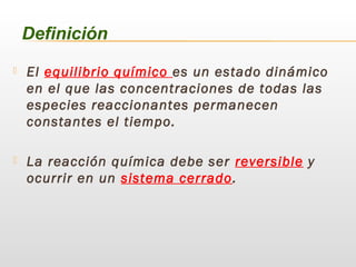 El documento describe los conceptos fundamentales del equilibrio químico, incluyendo su definición como un estado dinámico en el que las concentraciones de las especies permanecen constantes, la ley de acción de masas y la constante de equilibrio, y cómo los sistemas en equilibrio responden a cambios en la concentración, temperatura y presión de acuerdo con el principio de Le Chatelier.