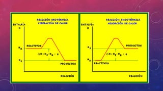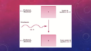 El documento trata sobre conceptos fundamentales de equilibrio químico. Explica que el equilibrio químico ocurre cuando las concentraciones de reactivos y productos se estabilizan, formándose y deshaciéndose a la misma velocidad. También define la constante de equilibrio como la relación entre las concentraciones de reactivos y productos en equilibrio. Finalmente, detalla algunos factores que afectan la velocidad de las reacciones químicas, como la temperatura, estado de los reactivos y su concentración.