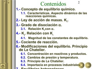 Este documento trata sobre el concepto de equilibrio químico. Explica las características del equilibrio químico, la ley de acción de masas y la constante de equilibrio Kc. También cubre temas como el grado de disociación, la constante de equilibrio Kp, y cómo se ven afectados los equilibrios químicos por cambios en la concentración de reactivos y productos, presión y temperatura.