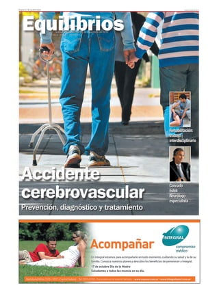 El documento habla sobre la importancia de la actividad física para prevenir accidentes cerebrovasculares y enfermedades cardíacas. Menciona que el sedentarismo aumenta el riesgo de estas afecciones y que aunque es difícil encontrar tiempo para hacer ejercicio, actividades como caminar tienen grandes beneficios para la salud. También describe factores de riesgo de accidentes cerebrovasculares, incluyendo la hipertensión y diabetes, así como los pasos a seguir en caso de que alguien sufra un ataque.