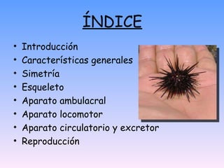 Los equinodermos son invertebrados marinos como las estrellas de mar, erizos, pepinos de mar y ofiuras. Tienen simetría pentarradial, esqueleto interno formado por osículos calcáreos, y un sistema vascular acuífero. Se desplazan y alimentan usando pies ambulacrales, y se reproducen sexualmente de forma externa.
