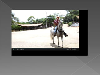 El documento proporciona información sobre los caballos, incluyendo los nombres de las hembras y crías, las diferentes razas según su tamaño, los colores más comunes, y las modalidades de pasos como el paso fino, trote y galope.